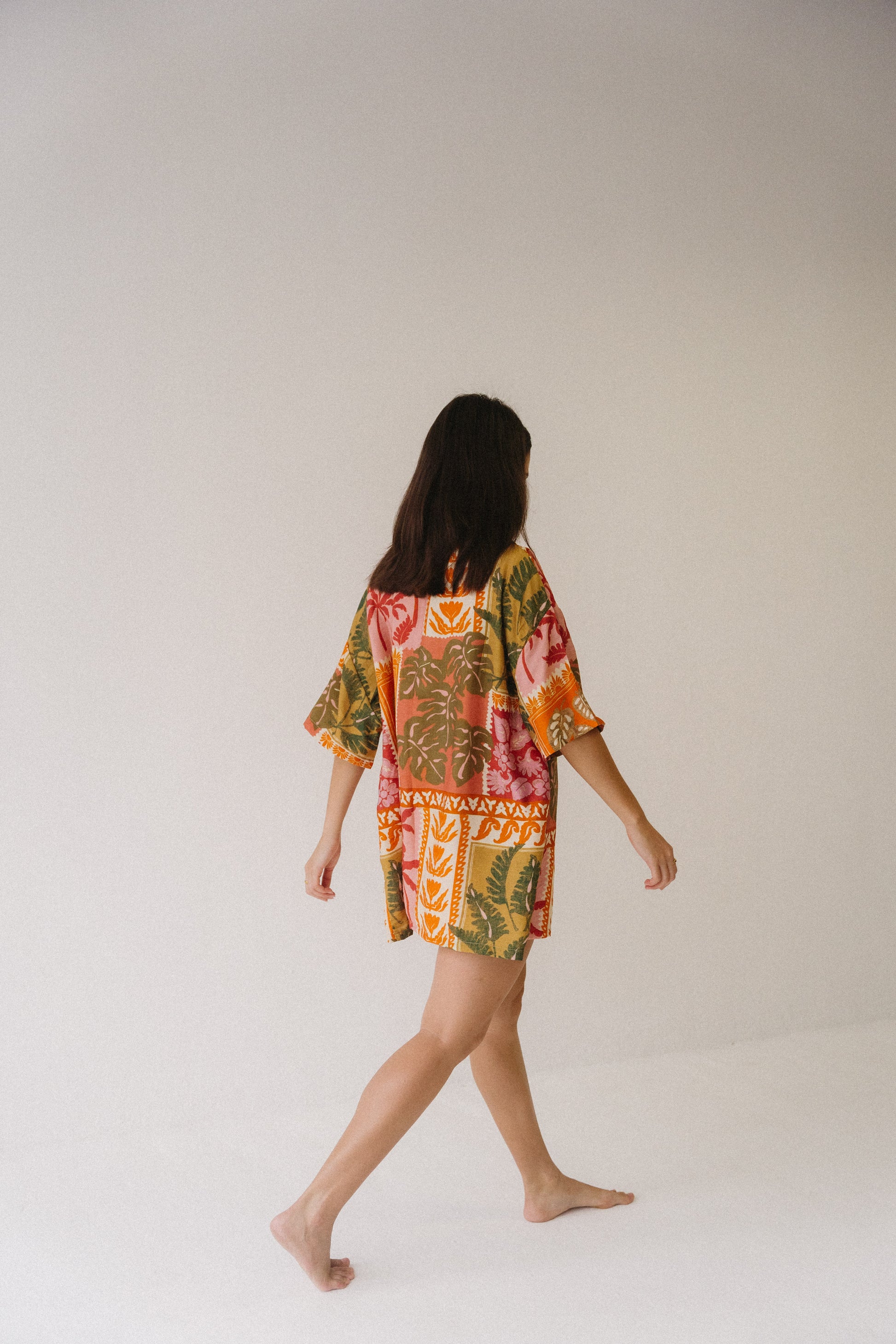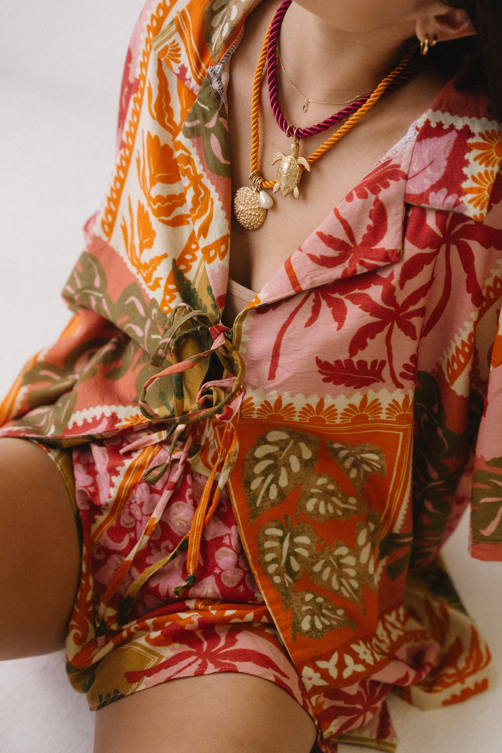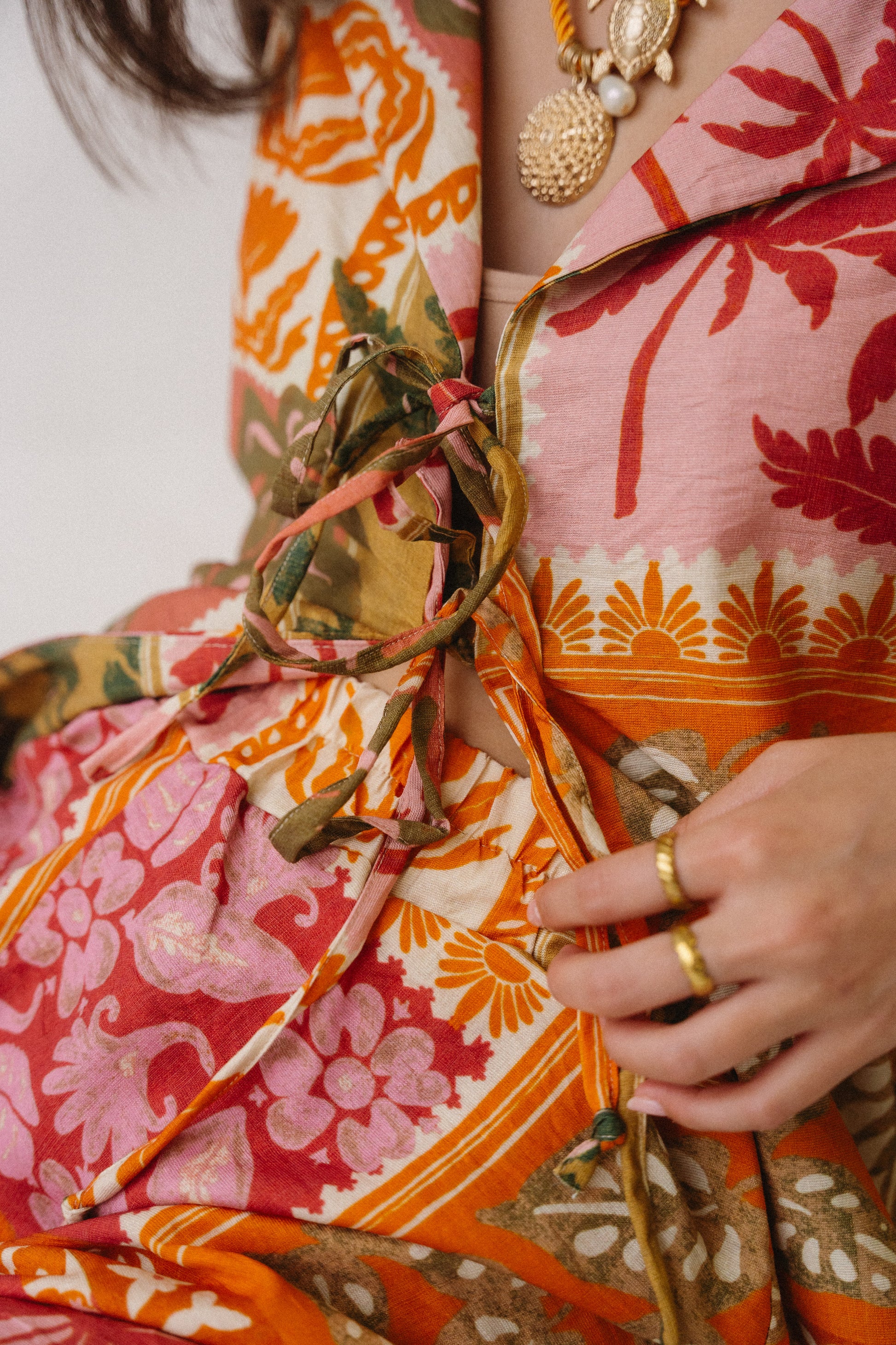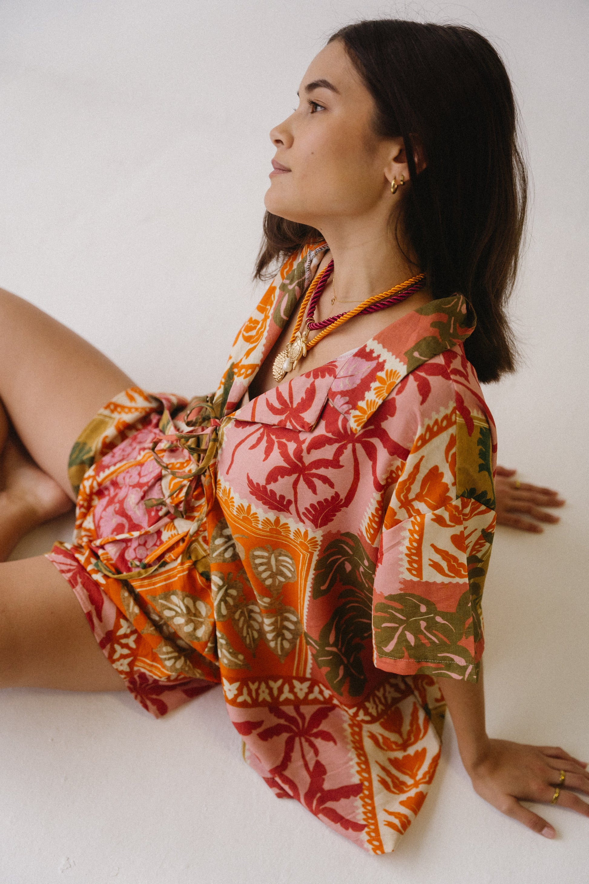 A celebration of colour, craft, and carefree spirit. The Sol Set is cut from a soft, breathable linen blend, hand-printed in a bold sunset palette of coral, saffron, and olive. Lightweight yet full of life, each piece is finished with delicate ties and soft gathering, offering a flattering fit that drapes naturally against the body.