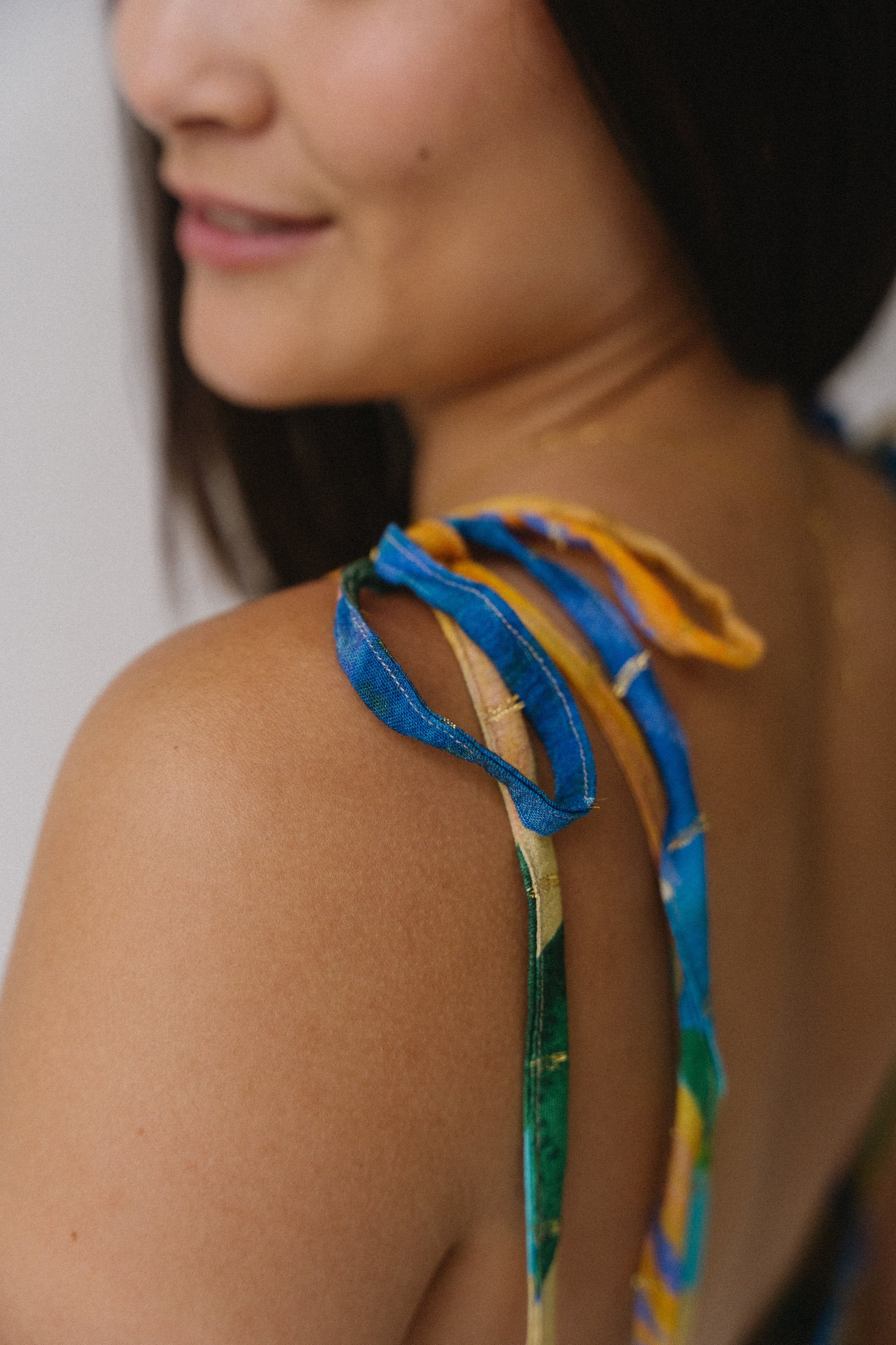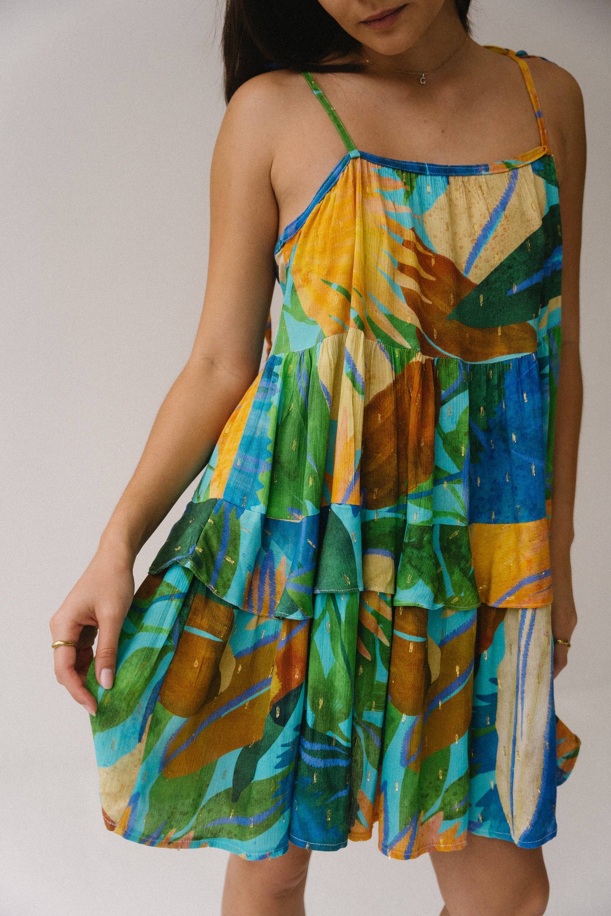 The Bali Dress in Sea Glow captures the calm shimmer of ocean light. Softly woven with a subtle metallic thread, it glows gently as it moves — an effortless balance of ease and quiet elegance. The hand-painted floral print and tiered silhouette lend a relaxed femininity, while the lightweight viscose drapes beautifully for everyday wear or seaside evenings.