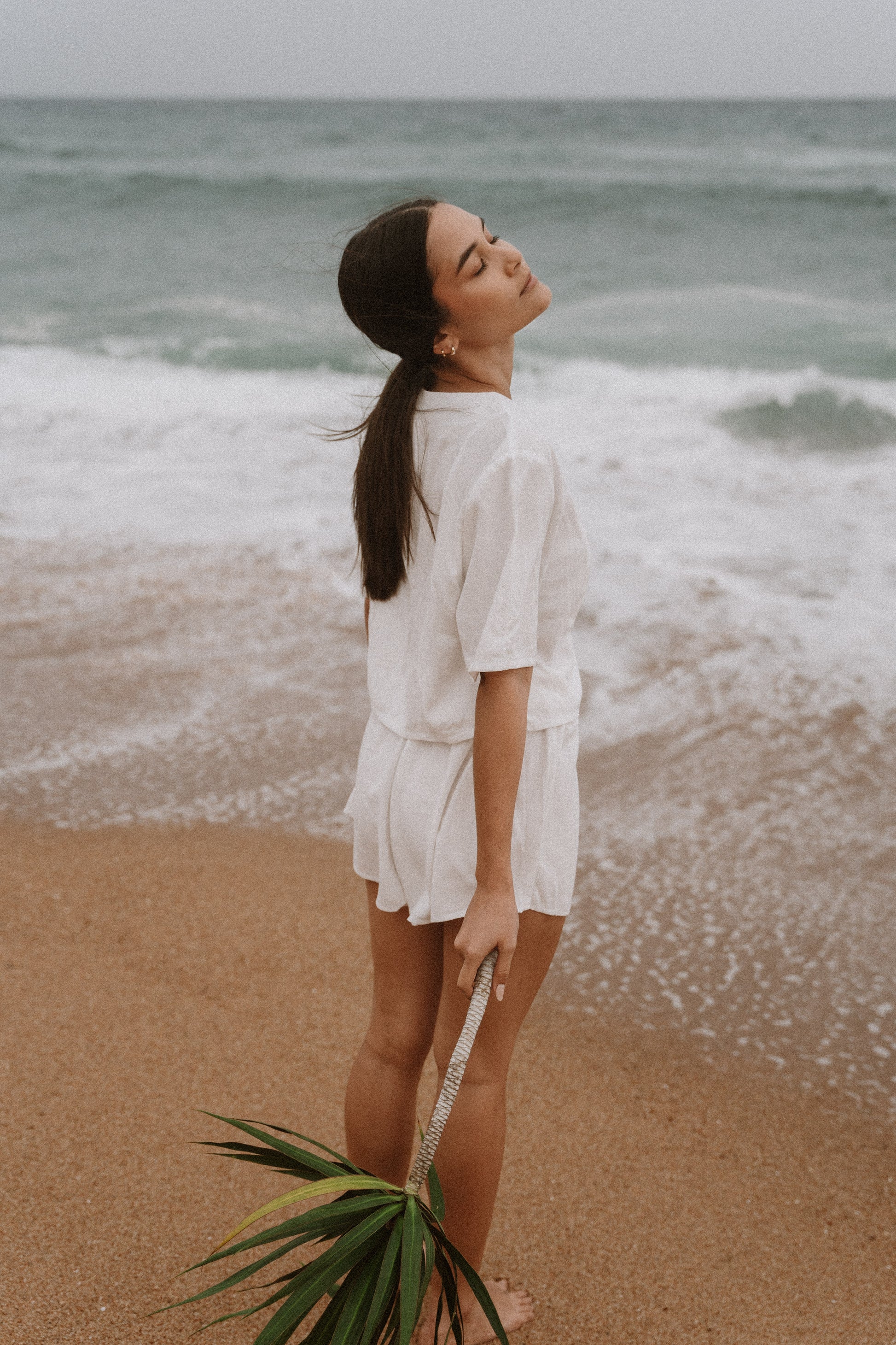 Effortlessly refined, our St Tropez two-piece set is crafted from pure Linen — a fabric celebrated for its breathability, softness, and enduring quality. Designed for comfort and ease, it features a relaxed V-neck top with a single shell button detail and gently draped short sleeves, paired with elaticated shorts that offer a comfortable, adjustable fit.